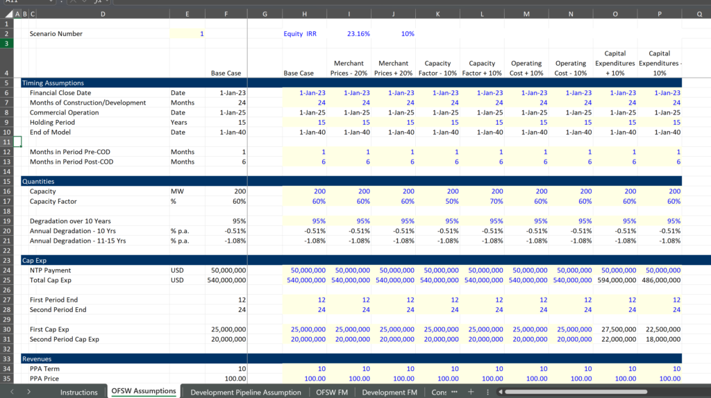 When teaching courses I often run into arrogant modellers. I have this feeling that they see me and think that such an old man cannot tell us anything about modelling. In the case exercise, completed excel file and the video below I try to show you what is important in completing a model. The case below seemed intimidating and had terms like MoM for money multiple where the total inflow to equity is divided by the total outflow of equity capital or HtM which means hold to maturity. At the end you as usual have to compute the equity cash flows, the equity IRR and the cash flow statement. The case looks stressful and will take a while but if you can work through it quickly I think it is good practice. I show the case excerise connected to the first button below and then the completed exercise attached to the second button. This is followed by a boring three hour video that goes through the exercise. An illustration of the InputC page that drives the offshore wind portion of the model is shown below.