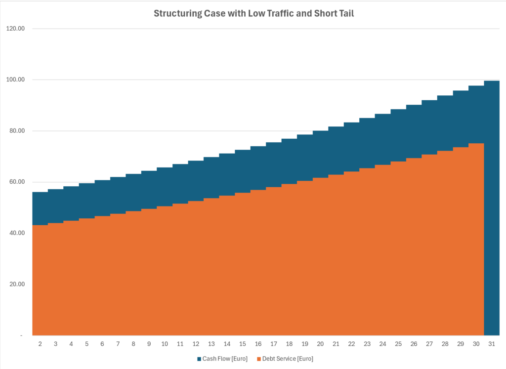 In this session we address a structuring potential for debt where the structuring begins with a downside case (in a tollway case, where the debt size is derived from a minimum traffic guarantee) and using a very short tail. For example, a case where the tail is only one year. This structuring can result in a high debt to capital ratio and result in a relatively low equity contribution. But the lender would like to adjust the tail so that there is ability to re-structure the debt in the long-run.
