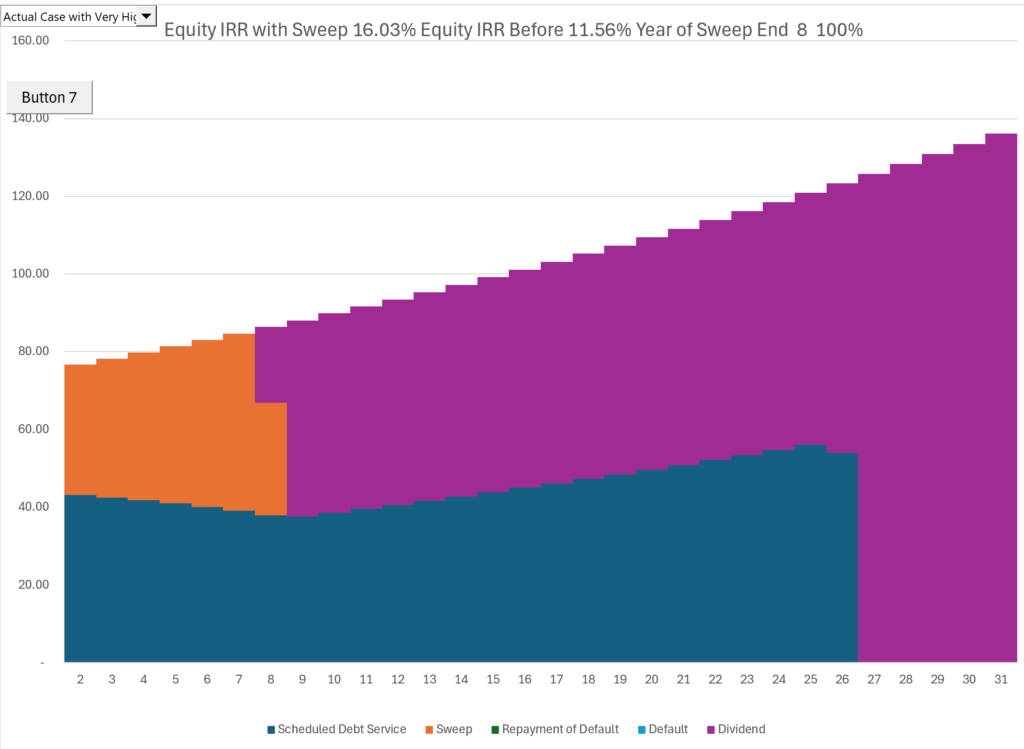 To allow the debt tail to be increased, a cash sweep of 100% is established which reduces the tail. This cash flow sweep continues at 100% until the tail reaches a target. When attempting to solve the problem of the length of the cash sweep necessary to reduce the tail, a goal seek formula does not work and there must be an adjustment to the final year of the sweep in order to develop an exact value. An illustration of how a cash sweep can be used is shown in the two screenshots below. The first screenshot shows a case with debt structuring and the second illustrates a case with higher traffic, a 100% cash sweep and a lengthened tail. After the screenshot a file that is used in the session is attached to the blue button.